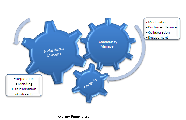 In many (but not all) instances, a company will need to have both a social-media manager and a community manager if its chosen strategy includes integrated, holistic marketing on social media, online networks, and other related locations. Both roles usually support and interact with each other along with the others at the company, and Blaise Grimes-Viort summarized the interaction in this graphic: